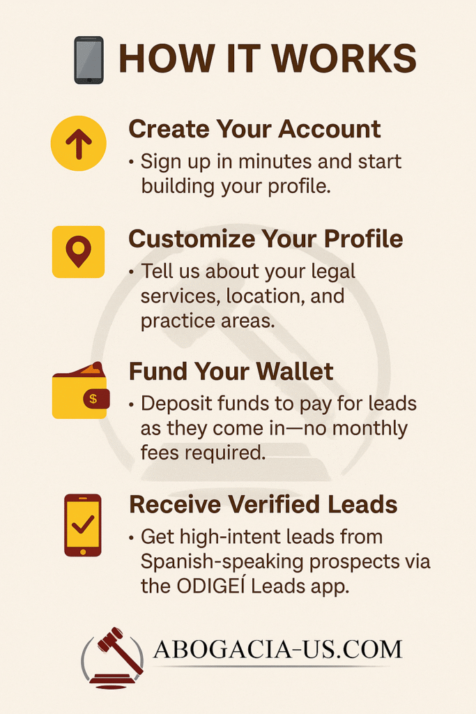 Welcome to Abogacia-Us.com, the trusted platform connecting attorneys with U.S. Hispanics actively searching for legal help in their native language. Whether you’re a solo practitioner or a growing law firm, our Pay-Per-Lead model helps you get discovered, contacted, and hired—without breaking the bank.